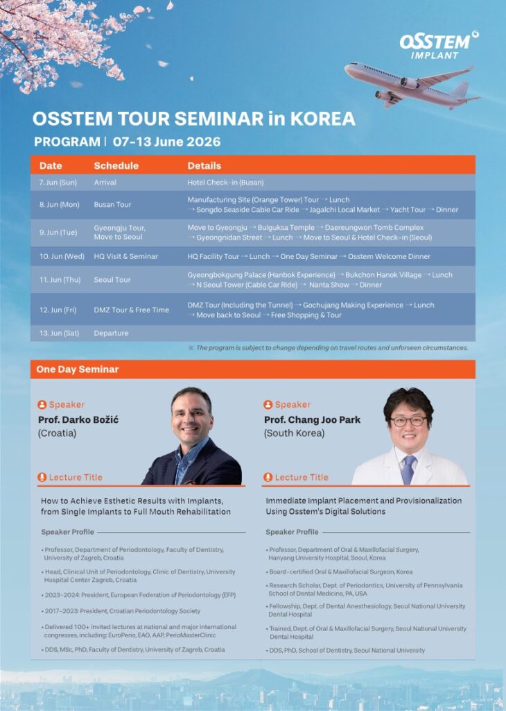 Aicinām jūs uz ekskluzīvu, profesionālu un izglītojošu braucienu uz Dienvidkoreju “Osstem Tour Seminar 2026”, kas notiks 2026. gada 7.–13. jūnijā.