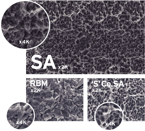 • SA virsmas morfoloģija ir par 45% raupjāka, salīdzinot ar RBM apstrādi