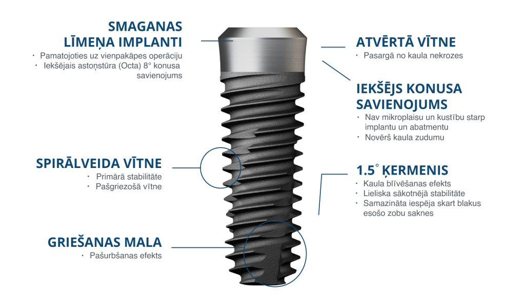 • Gļotādas (smaganu) līmeņa implanti ar iekšējo Octa un 8° konisko savienojumu, kuru pamatā ir vienpakāpes operācija.